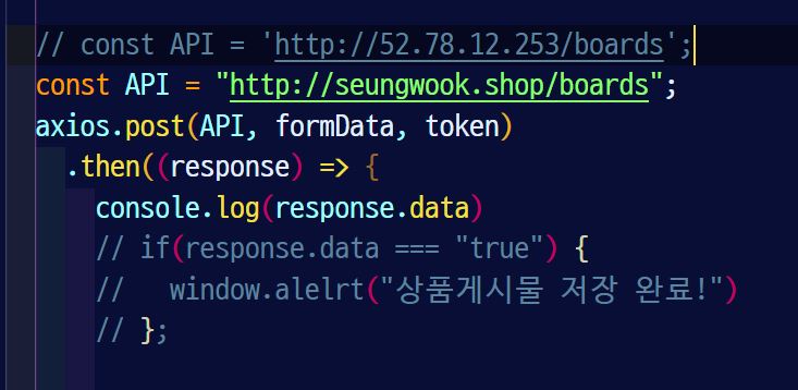 미니프로젝트를 진행하면서 프론트엔드에서 클라이언트-서버 통신을 하면서 axios를 이용하면서 API는 아래 이미지에 나오는 코드를 작성해 이용했다.