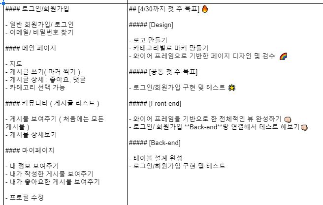 그리고 첫주에 프론트-백이 각자 해야 할 일을 분배했고, MVP(Minial Viable Product) 기준에 맞는 구현 목표들을 아래와 같이 정했다.