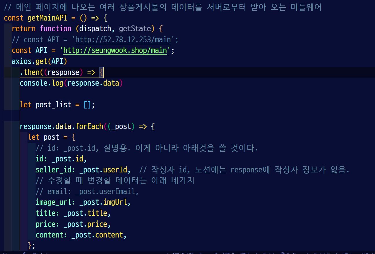 위 이미지처럼 처음에는 이렇게 데이터를 서버로부터 받아 와서 메인페이지의 여러 상품게시물틀에 넣어주려고 했으나, 되지 않았다. 왜냐하면 위의 코드는 상세페이지용 코드여서, 여러 상품의 정보를 받는 것이 아니라 특정 상품의 데이터를 가져오는 것이었기 때문이다. 지난주의 클론코딩 인스타그램의 코드를 참고해서 짰던 걸 보고 가져와서 조금 손 본 것이 이번것과는 맞지 않아서 생긴 문제였다. 왜냐하면 클론코딩 인스타그램에서도 상세페이지가 있긴 하지만 상세페이지가 메인페이지의 게시물 정보를 그대로 물려 받기 때문에 메인페이지로 데이터를 한번 받아두면 끝이었기 때문이다. 그래서 저 코드에서는 원래 forEach 함수를 이용해 받아온 여러 상품에 관한 데이터들을 한 게시물씩 묶는 코드가 있었다. 하지만 이번에는 상세페이지에 한 상품에 관한 정보만 받아 오는 것이므로 forEach를 쓰지 않는게 맞아서 저렇게 고쳤다. 메인페이지에서 데이터를 물려 받으면 사실 상세페이지 데이터를 받는 미들웨어는 없어도 되지만, 상세페이지는 메인페이지의 게시글보다 더 자세하고 많은 정보를 서버에서 보내므로(메인페이지에는 없는 상품의 더 자세한 상태 같은것) 상세페이지로 보내는 데이터는 메인으로 보내는 것과 다르게 서버에서 보내기 때문이다. 사실 이걸 깨달은건 백엔드 분이 메인페이지에 정보는 여러 상품 정보를 보내주니 forEach를 써야 하지만, 상세페이지는 그렇지 않고 한 상품 정보만 간다고 하면서 forEach를 써야 하는 경우와 아닌 경우가 있다고 설명해줬기 때문이다. 클론코딩에서 리덕스를 이해하는 법을 익히고 코드를 쓰는 방법을 알아뒀고, 백엔드 분의 적절한 조언이 있었기 때문에, 리덕스 모듈 파일을 성공적으로 수정할 수 있었다. 그 결과가 위의 상세페이지 정보를 받는 코드, 아래의 메인페이지의 모든 게시물 정보를 받는 코드다. 나도 이렇게 코드를 잘 짜낼 줄 몰랐고, 백엔드분의 도움을 받아서 해낼 줄은 더 몰랐다. 이렇게 발전하는 느낌이 참 신기하기도 하고 짜릿하기도 했다. 백엔드분이 차분하게 설명해주고 도와준 덕분이 컸다. 항해99의 운영진이 말하는 서로 협력하는 사람, 같이 일하고 싶은 사람이 되어라는 말은 이런 것을 두고 한 말일 것이다.
