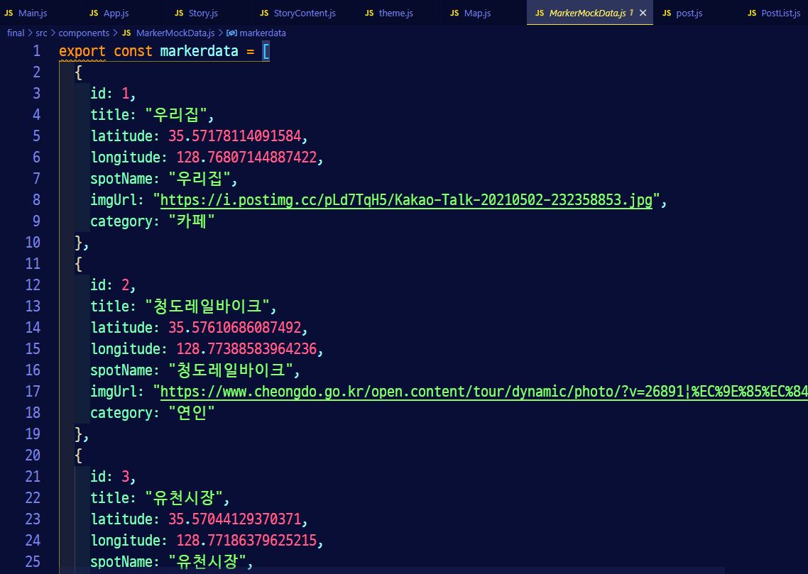 물론 이것만 문제는 아니었다. 앞서 언급한 미니프로젝트를 지도 API로 했던 분의 git을 fork해서(라고 쓰고 약탈해와서라고 읽는다) 코드를 읽고 분석했지만 무얼 구현한 코드인지 감이 잡히지 않았다. 그래서 그분의 결과물 유튜브 동영상을 보고 분석도 하고, 그분과 같이 했던 리액트 분을 초빙해서 저 코드를 무엇을 구현하고 로직이 어떻게 되었는지 물어보기도 했다. 그래도 헤맸는데, 겨우 감을 잡은건 어느 분이 mockdata로 지도에 마커를 뿌리는 코드를 소개한 블로그를 읽고 나서였다.