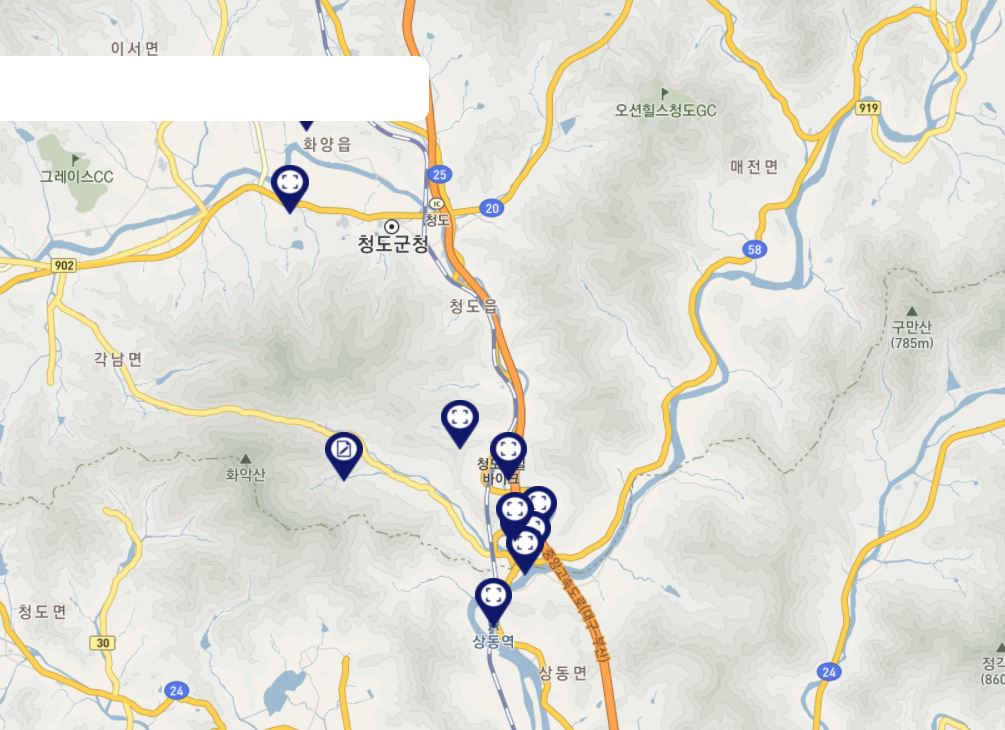 그리고 이 데이터를 저 블로그에 나온 코드와 카카오 지도 API 소스 코드로 내 코드를 만들어서 지도에다 뿌려주면