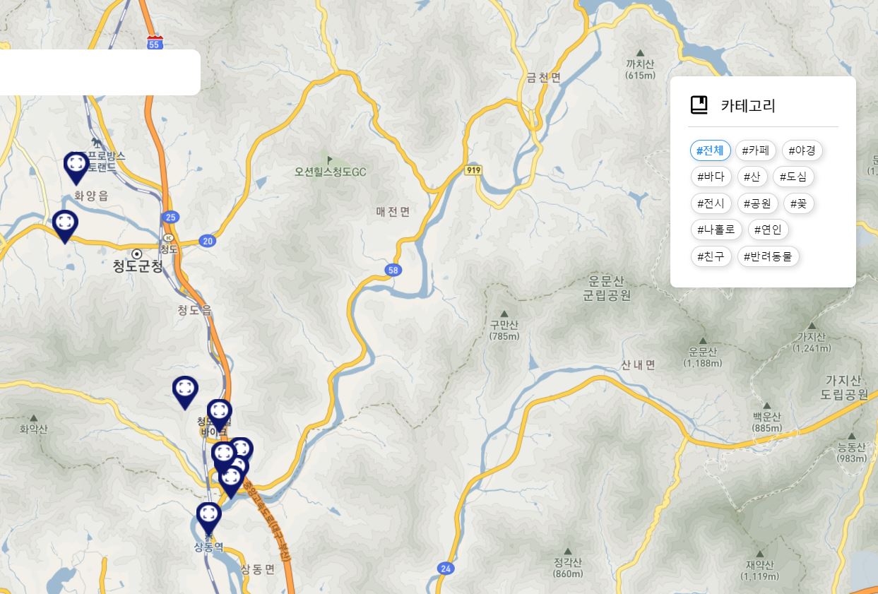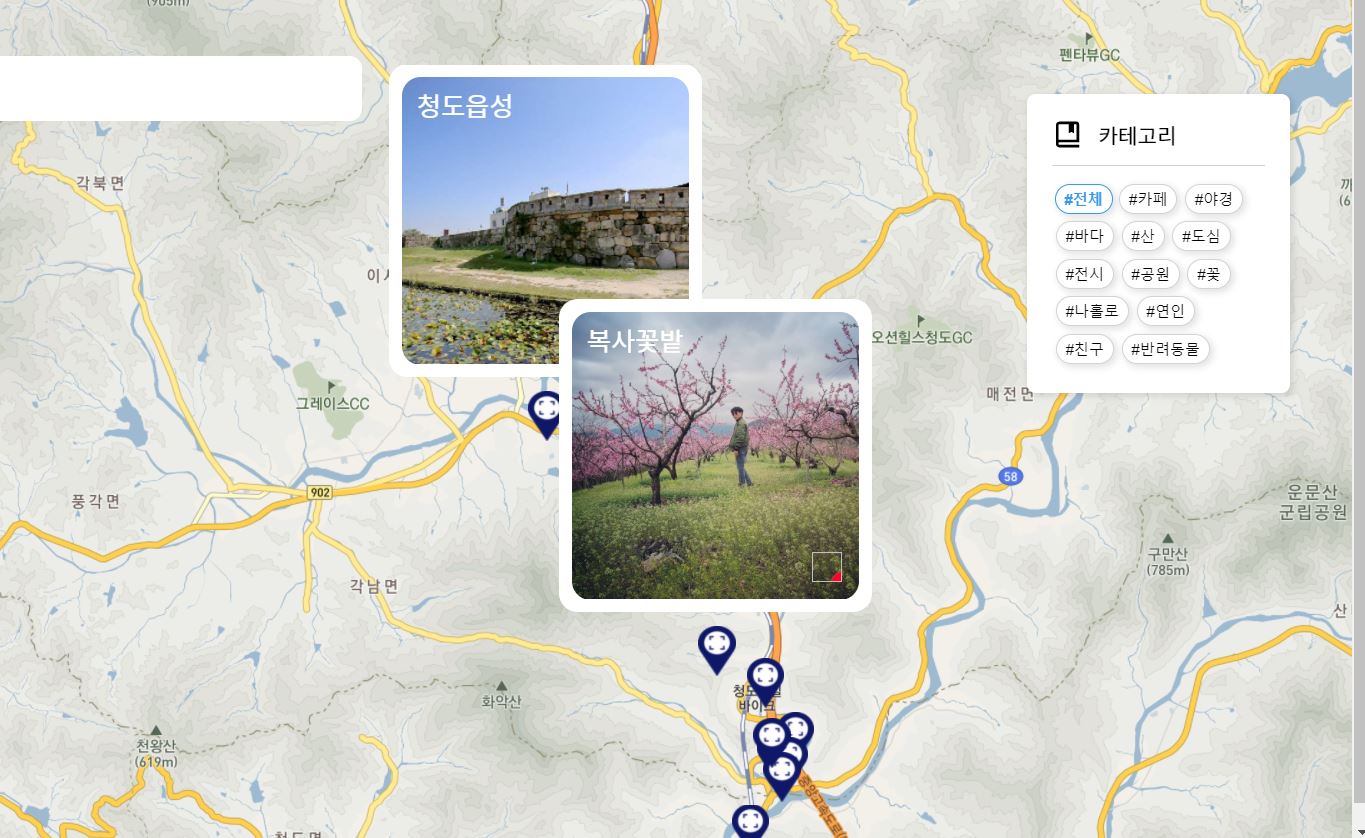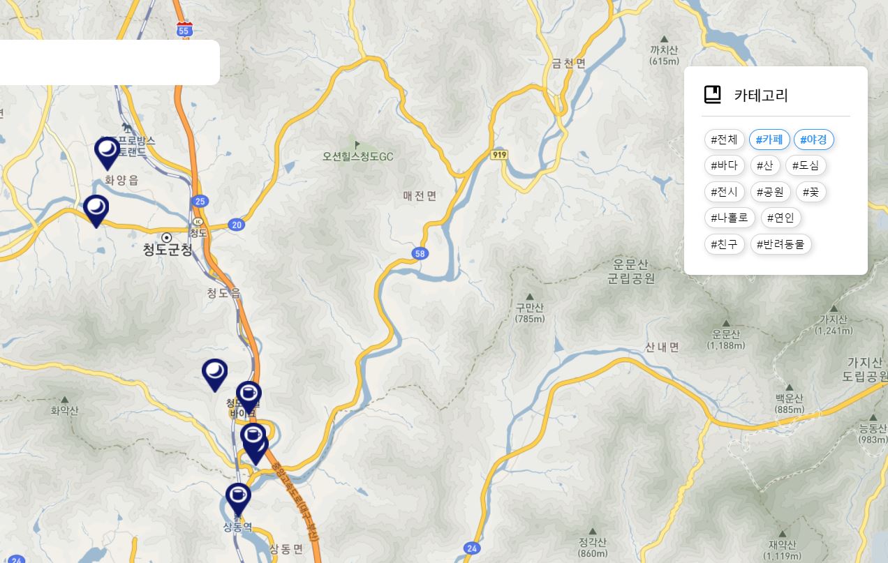 우리 프로젝트에서 MVP 기능의 하나로 선택한 카테고리에 맞는 마커를 지도위에 띄우는 것이 있었다. 쉽게 말하자면, 내가 '바다' 카테고리에 해당하는 마커들만 보고 싶다면 그렇게 할 수 있도록 하는 것이다. 일단 결과를 보자.