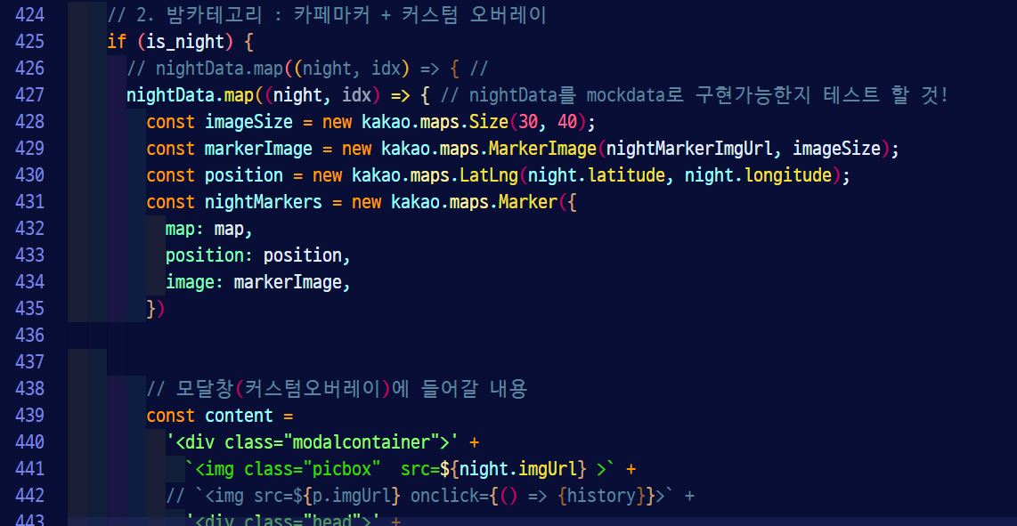 이 코드는 커스텀오버레이를 만든 코드다. 그런데 여기서는 커스텀오버레이를 순수 HTML로 만들고, 그것을 string으로 만들어서 content 변수에 할당하고 있다. 다시말해 리액트 환경이라 뷰는 JSX 문법으로 짜는게 정석이고 그것이 권장되는 방식인데, 이것만큼은 순수 HTML로 만든 것이다. 이로인해서 주석처리한 332번째 줄에 onclick(JSX문법이면 on'C'lick이어야 한다)으로 전달한 함수가 먹히지 않는다(그나마 다행인건 외부 css 파일로 스타일은 적용이 된다는 거다). 카카오 지도 API(이번 프로젝트에는 카카오 지도 API를 쓴다)의 커스텀오버레이를 만드는 소스코드를 찾아서 분석해보니, 구현하는 로직으로 봐서 리액트스럽게 JSX문법으로 커스텀오버레이의 뷰를 짜고 함수를 적용하는 방법이 있는지 내 지식 수준으로는 알 수 없겠다는 생각이 들었다.