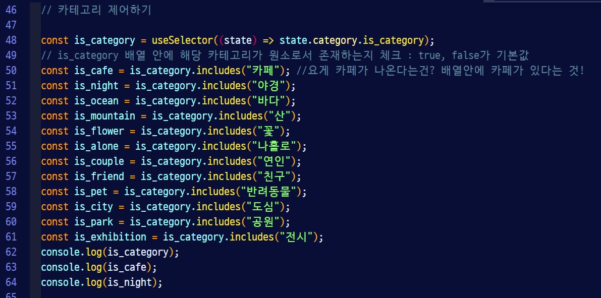 리덕스에서 각 카테고리들을 string 자료형으로(카페 카테고리는 "카페"라는 string으로 설정) 담는 배열을 가져오고, 그 배열 안에 해당하는 카테고리가 있는지 여부를 includes 함수를 이용해서 검사해서 있으면 true, 없으면 false값을 is_xxx 변수에 저장한다. 지도상에 띄워져 있는 카테고리 버튼을 눌러 선택하면 해당하는 카테고리가 배열안에 들어가고, 선택을 해제하면 배열에서 빠지게 해놓았다. 그리고 '전체' 버튼을 누르면 배열안의 요소들이 모두 제거가 되어서 배열의 길이가 0이 되고, 그 조건이라면 전체 마커가 뜨도록 했다.
