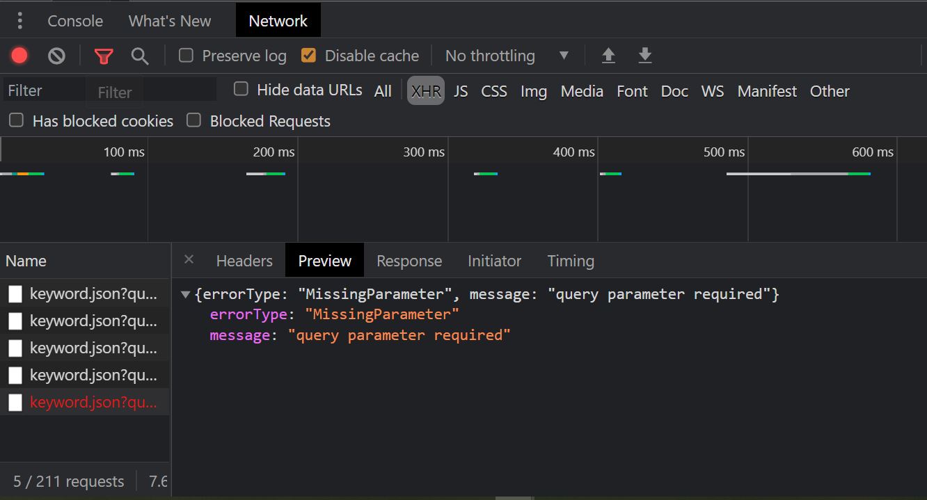 이걸로도 검색을 해봤는데, query 문제라고 하고 해결하는 코드도 있었다. 하지만 내가 작성한 검색 코드에 그 해결하는 코드를 입력할 수는 없어보였다. 그래서 튜터님에게 물어봤더니, 저 콘솔창에 나오는 URL에 query에 아무것도 입력이 안 된 것이 문제로 보인다고 하셨다. 이 말씀에 나도 나름 추측을 해봤는데, query는 검색해보니 '데이터베이스에 질문을 해서 정보를 요청함'이라고 나왔다. 정보를 요청하는 것이 query라면 query의 값은 검색어라는 생각이 들었다. 그러니 검색어가 query에 값으로 입력이 되고 있지 않은 것 같다는 추측이 들었다. 이 추측을 튜터님에게 말씀드리니, 그럼 개발자도구를 열어서 Network를 보자고 했다. 그랬더니 아래와 같은 것이 보였다.