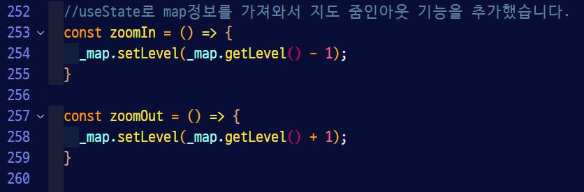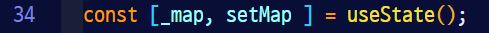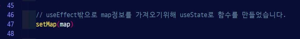 지도 이미지 정보를 담고 있는 map이라는 변수는 useEffect안에서 정의가 되고 할당이 되어서 지도 이미지를 로드하는데 쓰이고 있는데, useState로 그 변수를 useEffect 바깥으로 빼낸다. 그렇게 하면 _map에 할당된 map의 메소드를 활용해서 원하는 동작이 일어나는 함수도 만들 수 있다.