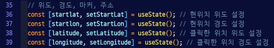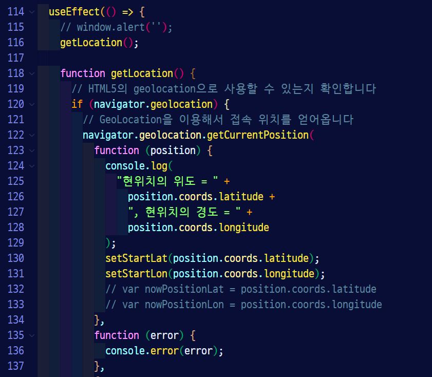 접속한 위치의 위도 경도 좌표값을 구해오는 코드 위의 코드에서 118번줄부터 시작하는 geoLocation 함수는 현재 접속한 위치의 위도 경도 좌표를 받아 내는 역할을 한다. 저 위도와 경도값을 알면 현위치를 중심으로 하는 지도가 로드되게 할 수 있다. 그렇게 하기 위해서 130번줄에서는 useState를 이용해서 setStartLat로 접속한 위치의 위도, 131번줄에서는 setStartLon로 접속한 위치의 경도값을 받게 했다. 그렇게 하면 코드 전역에서 접속한 위치의 위도와 경도 좌표값을 쓸 수 있다. 하지만 이렇게 useState 방법을 쓰는 걸 적용하기 전에는 이 함수로 알아낸 현위치의 위도 경도를 다른 곳에서 쓰는 방법을 몰랐다. 왜냐하면 주석처리한 132번과 133번줄처럼 저렇게 변수에 할당한 위도 경도 값을 전역에서 쓰는 방법만 궁리했기 때문이다. 이렇게 단순히 변수에 값을 할당하는 방식이라면 저 코드블럭 외부에서는 저 변수에 할당된 값을 사용할 수 없다. 그래서 geoLocation 함수 외부에 전역변수를 선언하고 그 변수들을 함수 코드블럭 내부에서 값을 할당하는 방식을 써봤지만 console.log에는 undefined라고 나와서 이 방법은 쓸 수 없었다. 그래서 잠시 궁리해보니 useState를 쓰면 간단히 해결 된다는 걸 깨닫고 저렇게 코드를 썼더니 문제는 간단히 해결 되었다.