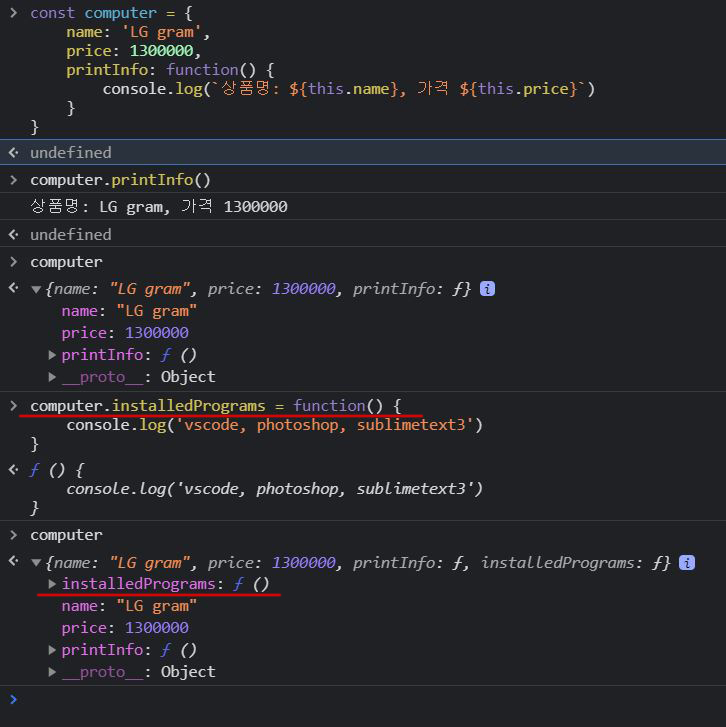 위 콘솔창에서처럼 객체의 경우, Object.prototype.method_name = function () {} 이런식으로 메서드를 부여하는 것이 아니라 instance.method_name = function() {} 이런식으로 특정 instance에서만 쓸 수 있는 메서드를 만드는식으로 해야 한다.