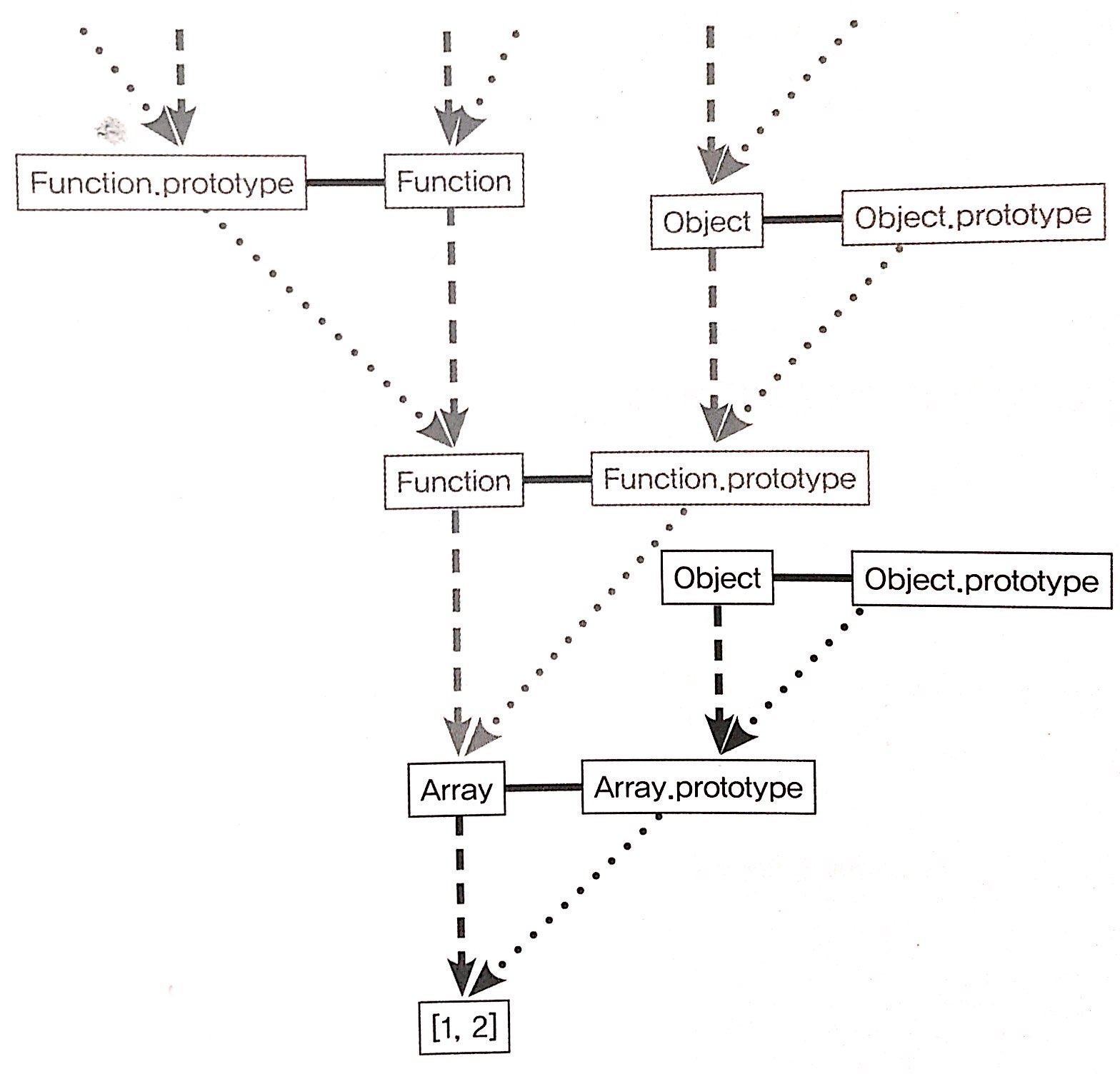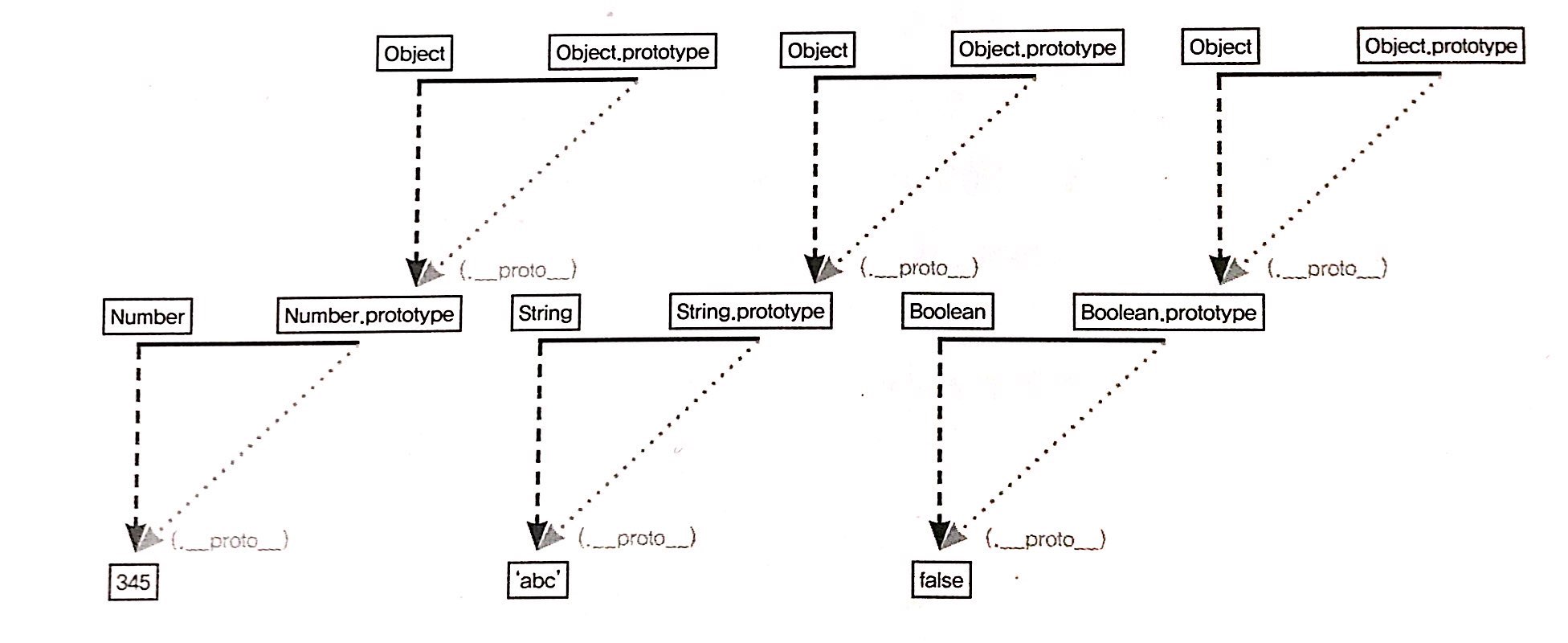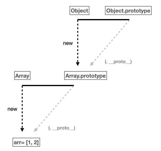 객체와 배열은 서로 데이터타입이 다르다. 그런데 배열의 내부구조의 맨 밑에 __proto__가 또 있어서 열어보면 객체의 __proto__안에 있는 메서드들은 객체의 __proto__ 안에 있는 메서드들과 같음을 알 수 있다. 이렇게 되는 이유는 prototype 객체도 '객체'이고 모든 객체의 __proto__는 Object.prototype이 연결되기 때문이다. 개념도로 표현하면 다음과 같다.