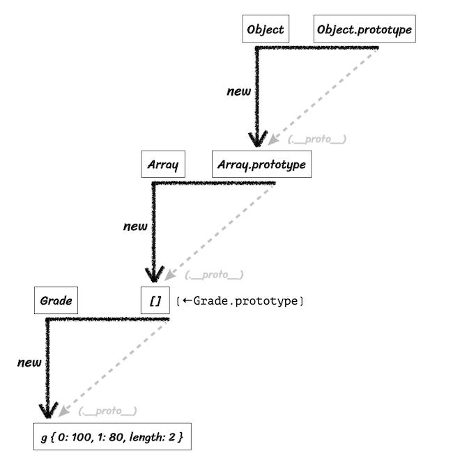g는 생성자함수 Grade 내부의 규칙에 의해 생긴 유사배열객체 인스턴스다. 이 유사배열객체인 인스턴스 g에다가 배열메서드를 쓰게 하고 싶다면 다음과 같이 g.__proto__와 같은 것을 참조하는 Grade.prototype이 배열의 인스턴스(= [1,2] 같은 실제 배열)를 바라보게 하면 된다.