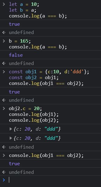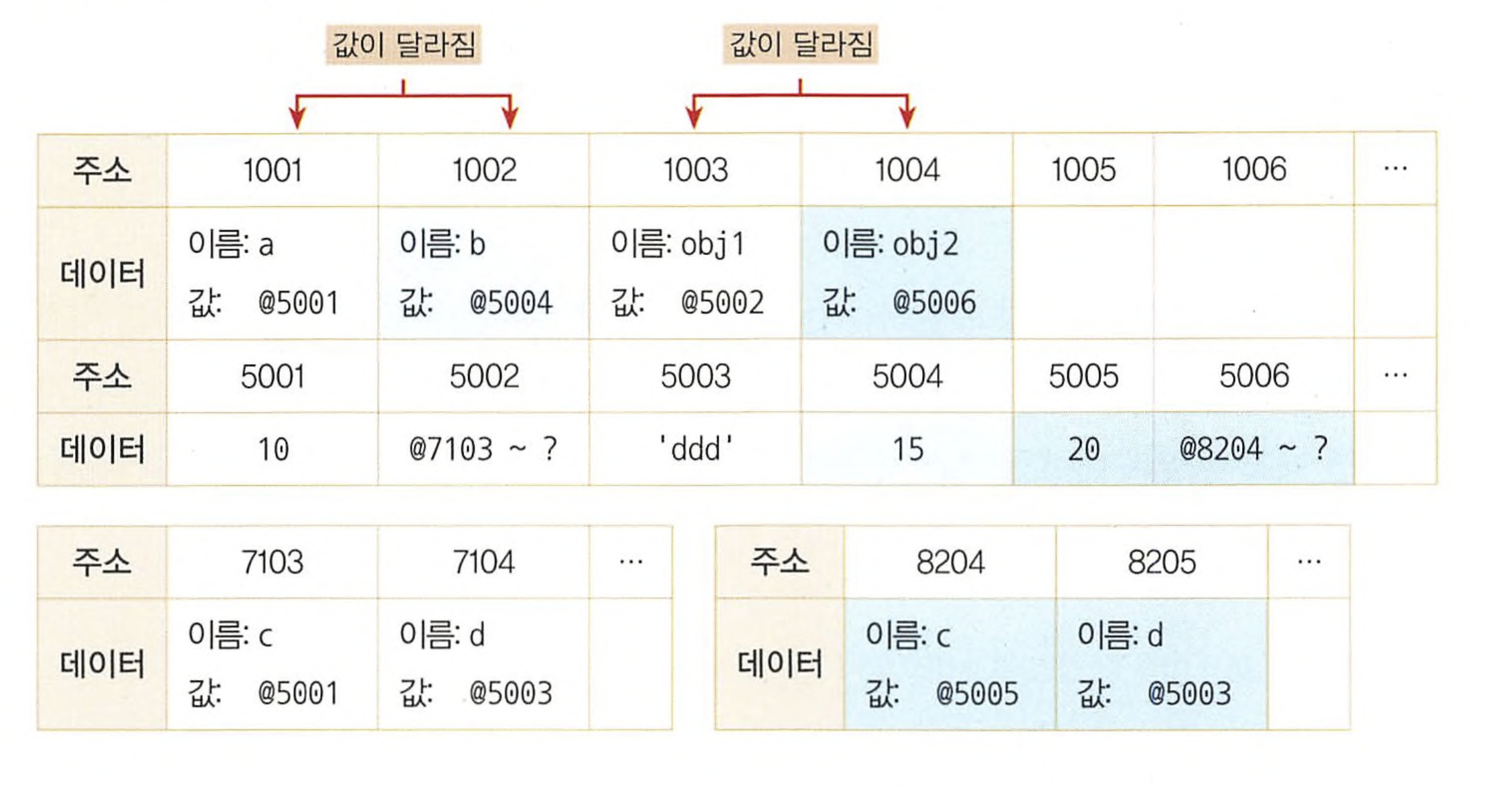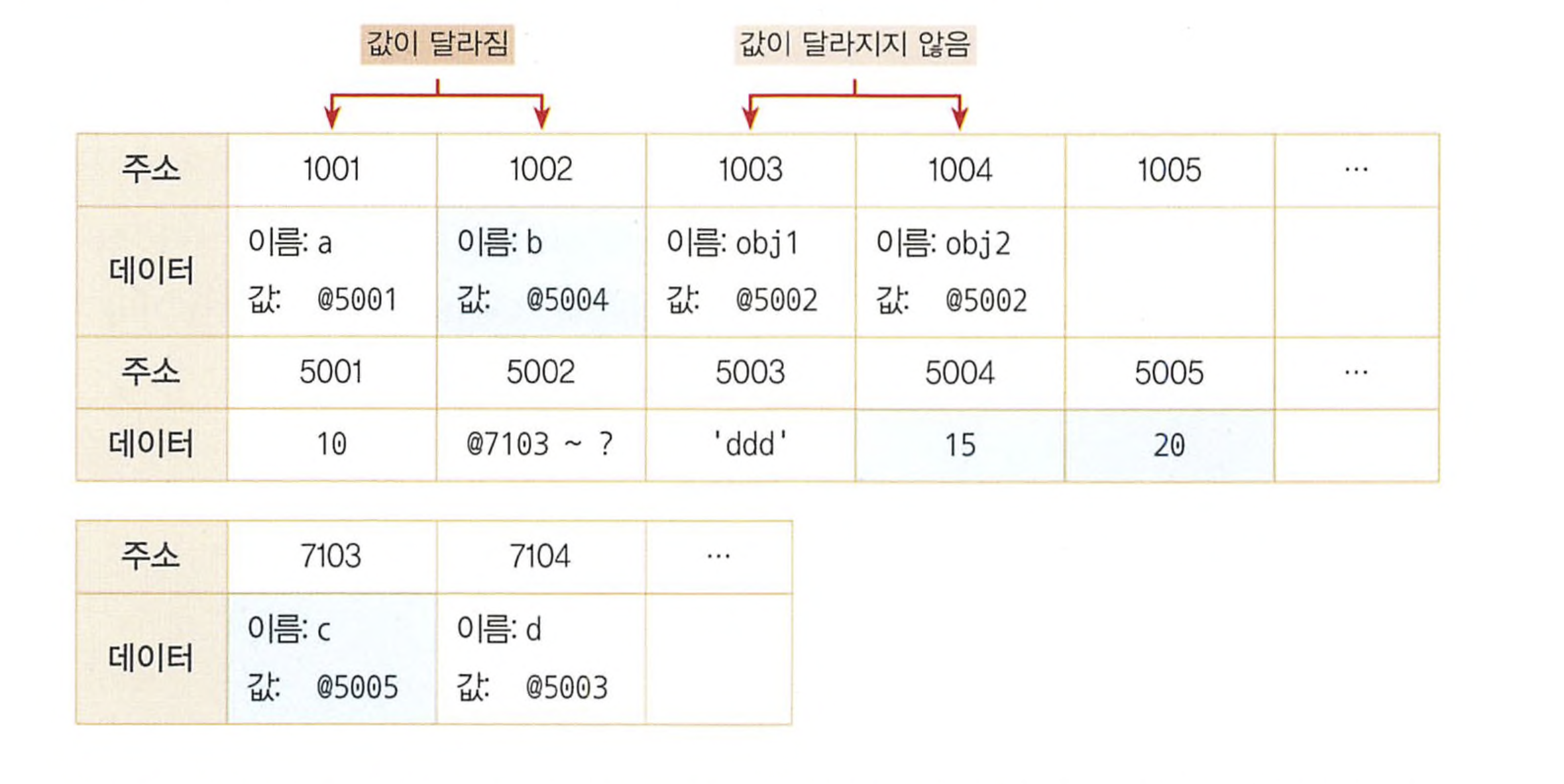 기본형 데이터인 숫자형 데이터는 데이터를 바꾸면 참조하는 데이터 영역의 주소가 바뀌면서(= 변수 영역의 값이 바뀌면서) a와 b는 서로 다른 데이터가 된다. 그러나 참조형 데이터인 객체의 경우, 내부 프로퍼티를 바꿔도 객체 프로퍼티의 변수 영역이 참조하는 데이터 영역의 주소만 바뀌지 변수영역이 참조하는 데이터 영역의 주소는 바뀌지 않기 때문에 서로 obj1과 obj2는 같은 데이터로 간주 된다. 이것이 바로 참조형 데이터는 가변값이라는 개념으로, 참조형 데이터는 내부 프로퍼티를 바꾼다고 해도 변수영역이 참고하는 데이터 영역의 주소값이 바뀌지 않았기 때문에 내부 프로퍼티를 바꾸기 전의 데이터와 같은 데이터라고 간주 된다는 뜻이다.
