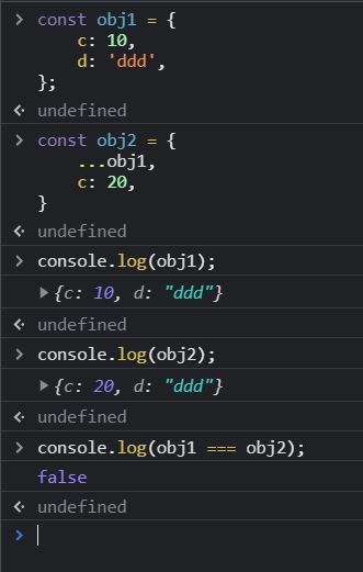 처음부터 있던 obj1을 spread operator로 복사해서 obj2를 만들었다. 그러면 obj1 === obj2가 false로 판정되면서 obj1과 obj2는 다른 객체로 판정된다(= obj2의 변수 영역이 참조하는 데이터 영역의 주소는 obj1과는 다른 주소다). 그래서 spread operator를 이용하면 객체의 불변성을 유지 할 수 있다.
