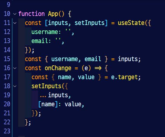 위 코드는 input 상자에 값이 입력되면, 원래는 내부프로퍼티에 키는 있지만 value는 빈 string이던 inputs 라는 state가 value에 입력값이 할당된, 원본과는 다른 새 데이터를 만드는(= 기존 input state를 복사해서 새 inputs state를 만든다. 즉, 불변성을 확보한 것) 코드다. 앞서 spread operator는 변수영역에서 참조하는 데이터 영역의 주소를 원본 데이터가 참조하는 데이터 영역의 주소와 다르게 하는 식으로 복사한다고 설명했다. 이 코드에서도 spread operator로 원본 데이터와는 다른 데이터가 생기게 했으므로 불변성을 확보했고, state도 변경 되었음이 감지 되게 함으로써 리렌더링이 된다.