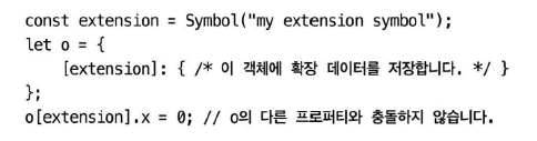 심벌이 반환하는 값은 다른 심벌값이나 다른 문자열과 같지 않으므로, 프로퍼티 이름이 겹치지 않는다.