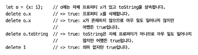 delete 연산자 특성: 삭제 성공 or 없는 프로퍼티 삭제 시도 해도 true로 평가 됨.