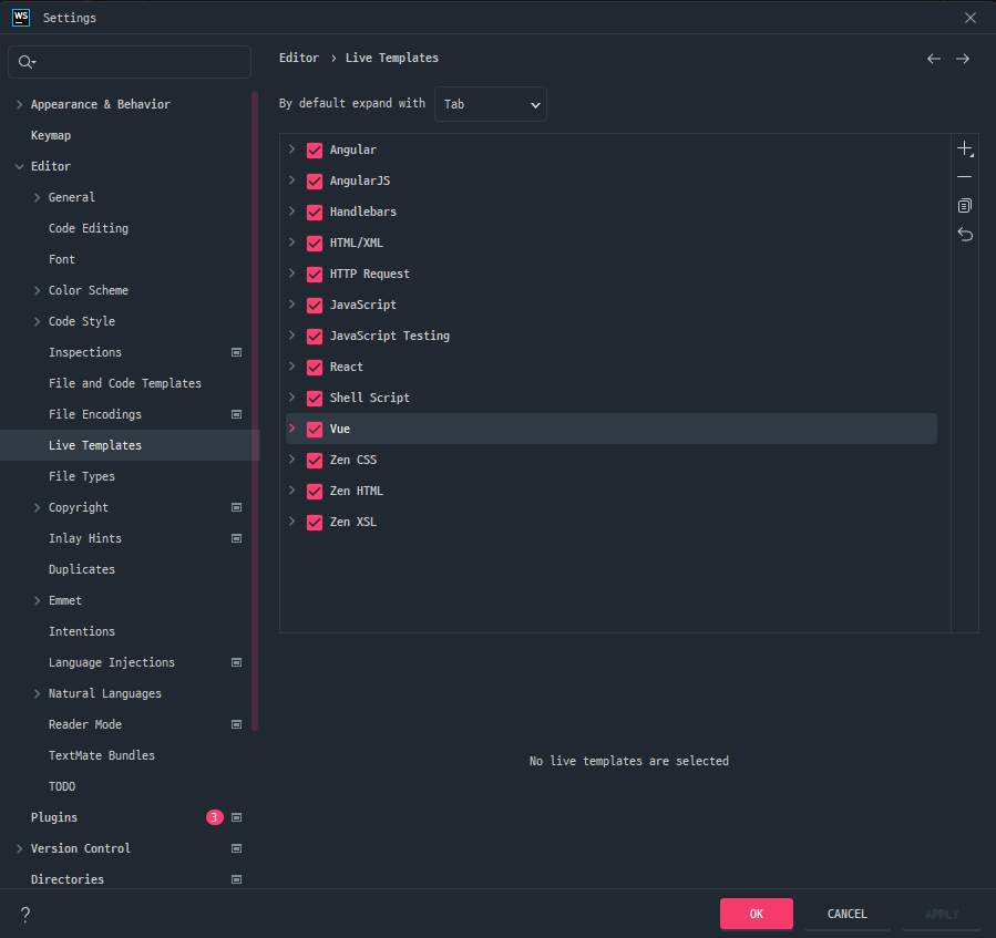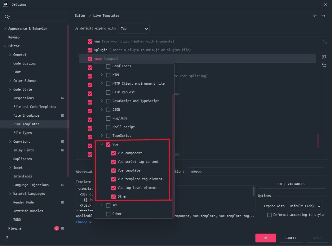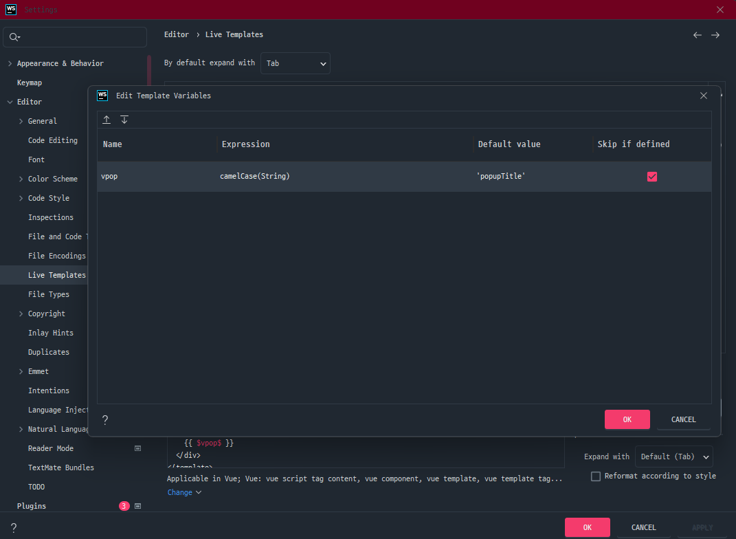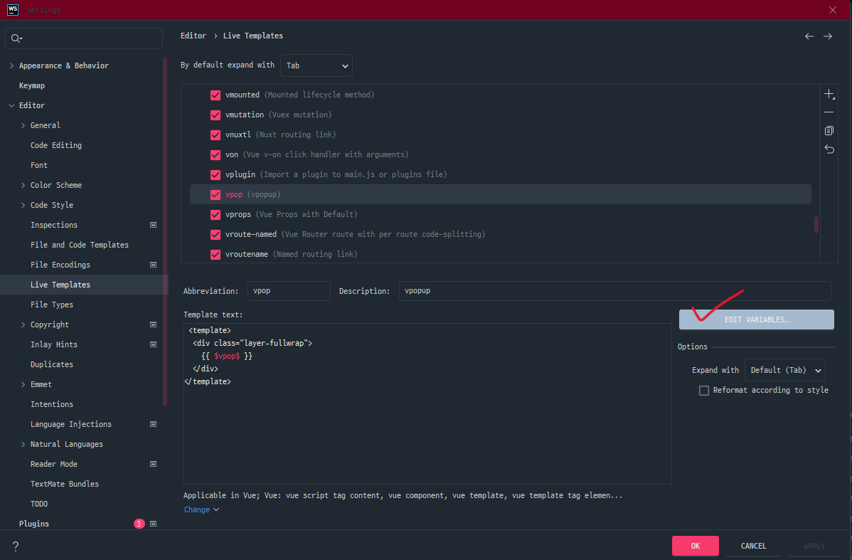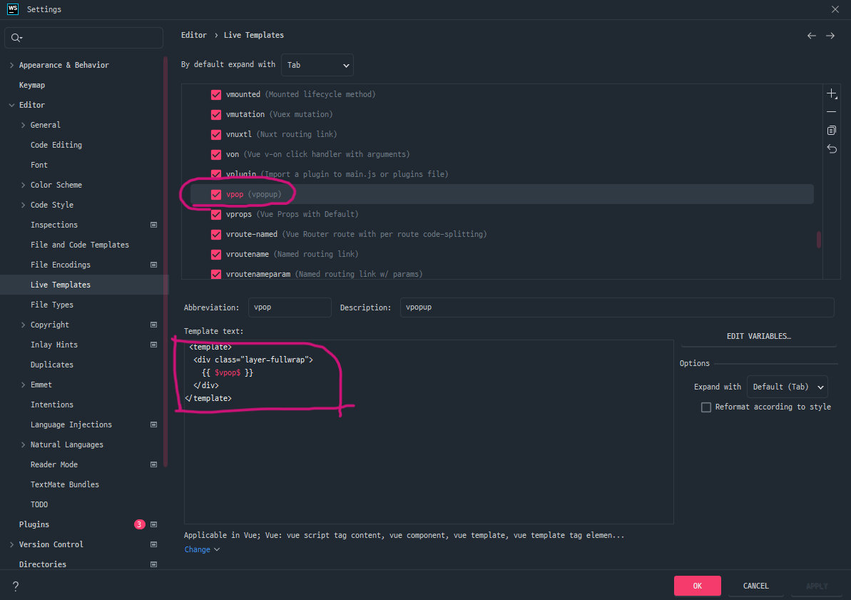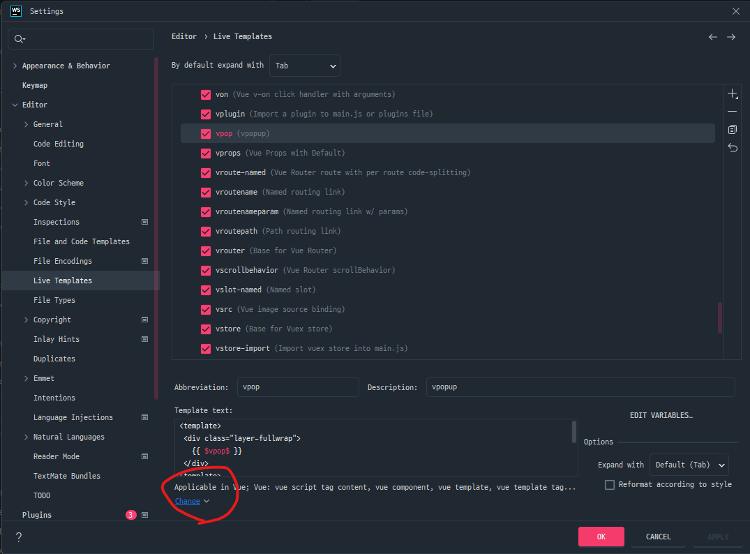 Settings에서 Live Template으로 들어가서, 예시로 Vue에서 쓸 라이브템플릿을 만들어 보겠다.