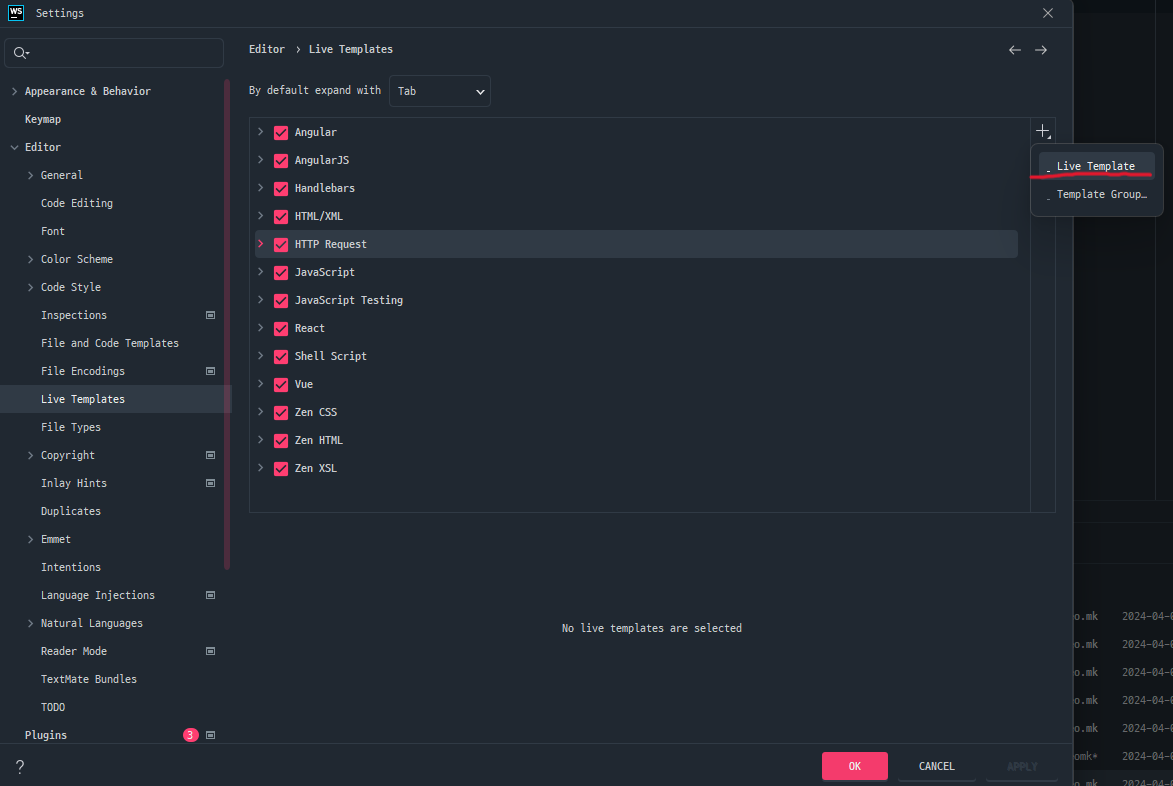 먼저 오른쪽의 + 버튼을 눌러서 나오는 Live Template을 클릭하자.