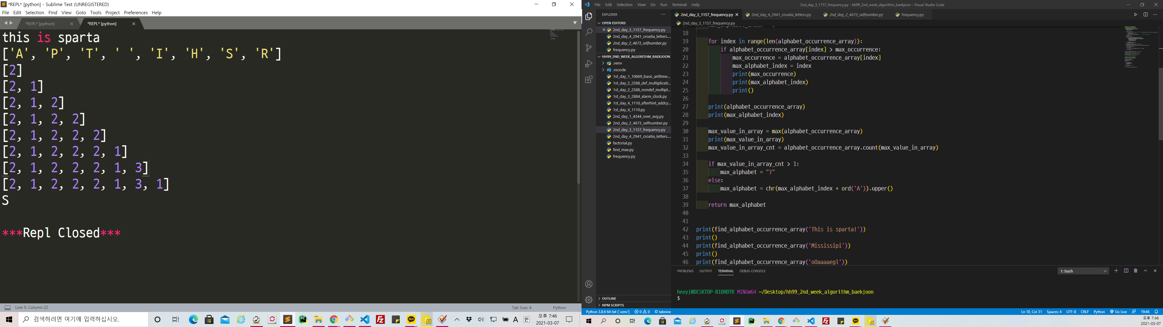 생각보다 어려웠다. 항해99에서 제공하는 스파르타코딩클럽의 알고리즘 강의에서 비슷한 문제에서 힌트를 얻어서 풀이의 단초를 얻었지만, 중간에 엄청 막혔다. 여기서 GG를 쳤으면 검색해서 답을 찾고 편하게 갔겠지만, 오기가 생기기도 하고 여기서 어려운 걸 해결해야 내 뇌에 개발자의 알고리즘 뇌회로가 생기고 풀었을 때 찾아올 희열에 확신을 갖고 도전했다. 힘들면 누워서 잠시 눈을 감고 이완하면서 문제를 생각하기도 하고 내가 안다고 착각했지만 사용법을 몰랐던 메소드를 검색해서 코드에 넣어서 원하는 대로 로직이 돌아가는지 검사하고 하여간 포기하지 않고 계속 했다. 생각을 거듭해도 풀리지 않자 코드에 print()를 넣어 중간 결과를 보면서 하기 위해서 내가 애용하는 sublime text를 동원했다. 결과 보여주는 건 sublime text가 아주 시원시원하게 잘 보여주니까. 그런 점은 vscode는 조금 모자라다. 내가 알지 못하는 vscode 플러그인은 sublime처럼 잘 보여주는지도 모르지만.