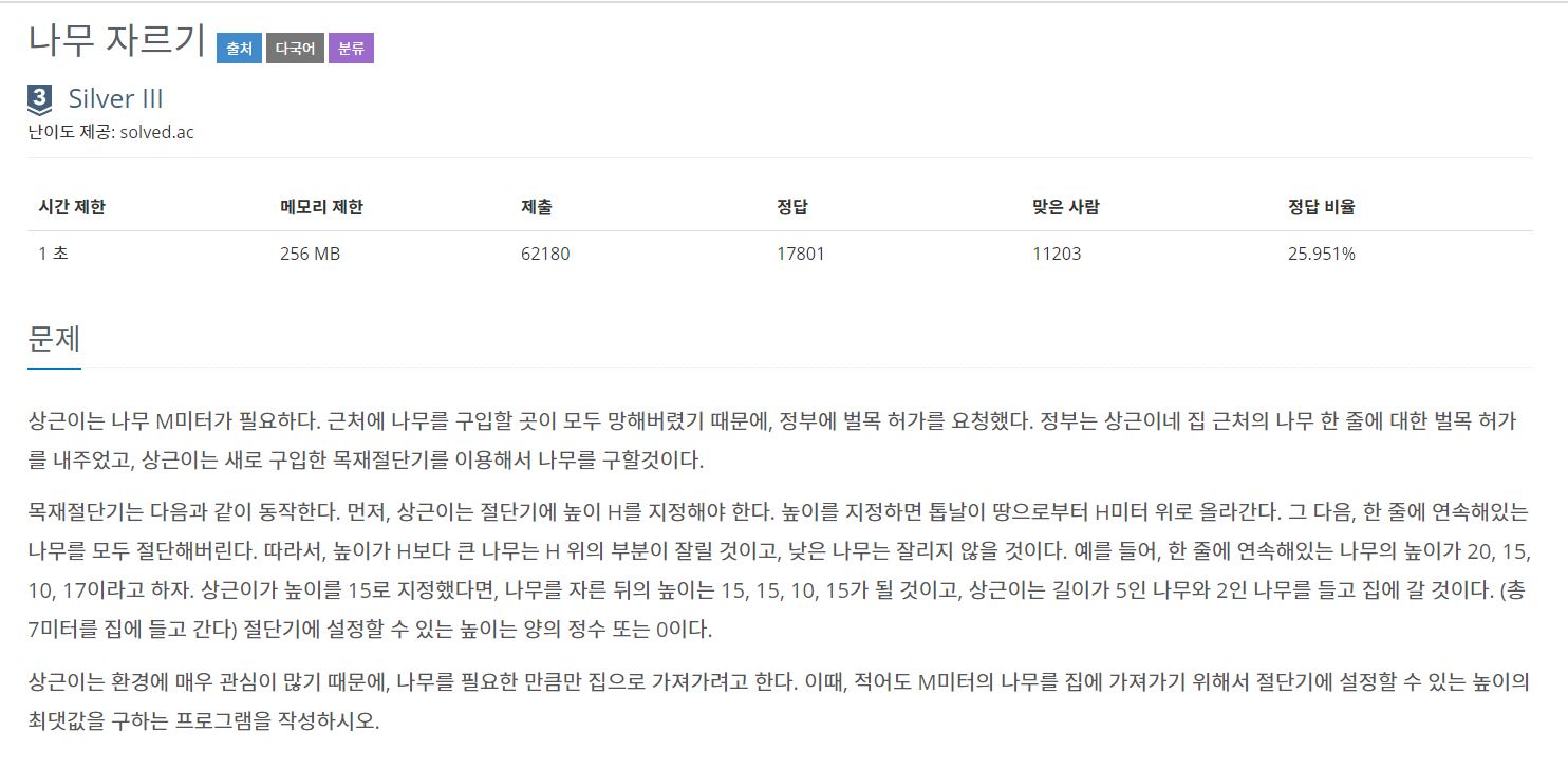 백준 2805번 나무 자르기 [파이썬]항해99_알고리즘 연습 중계 2021. 3. 15. 01:18